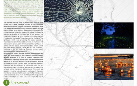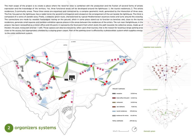 "Il tema fondante del progetto è quello di dare forma ad un luogo in cui l’esigenza di relax si coniughi con quella della produzione e fruizione di forme di espressione artistica e di scoperta e conoscenza del territorio. Intorno al faro si sviluppano, pertanto, tre zone funzionali: le residenze turistiche, le residenze per artisti e gli spazi collettivi, organizzati e connessi da complessa maglia geometrica, generata dalla interazione di tre sistemi di assi ordinatori. Il primo, incentrato sul faro, ha un andamento di tipo radiale, il secondo, di tipo ortogonale, si basa sulla giacitura del volume del rudere affiancato al faro ed, il terzo,infine, è composto da una serie di assi paralleli. Intorno a questa tessitura si snoda, infine il percorso verde di tipo didattico caratterizzato dalle essenze della macchia mediterranea. Le connessioni sono costituite da passerelle in legno appoggiate al suolo che in alcuni punti si innalzano a formare delle sedute, si allargano in prossimità delle residenze turistiche generando piccole piazze e spazi di esposizione all’aperto tra le residenze degli artisti. Il rudere vicino al faro è stato riqualificato come biglietteria ed info point e rappresenta il punto focale da cui di dipana il percorso verso gli spazi collettivi, composti dal teatro all’aperto, dalla piscina, dal ristorante e dal bar/caffetteria. Questi spazi possono essere fruiti anche da una utenza esterna a quella strettamente turistica, ragion per cui si è pensato alla localizzazione di un ampio parcheggio in prossimità della zona di accesso, opportunamente schermato da un tappeto verde inclinato."